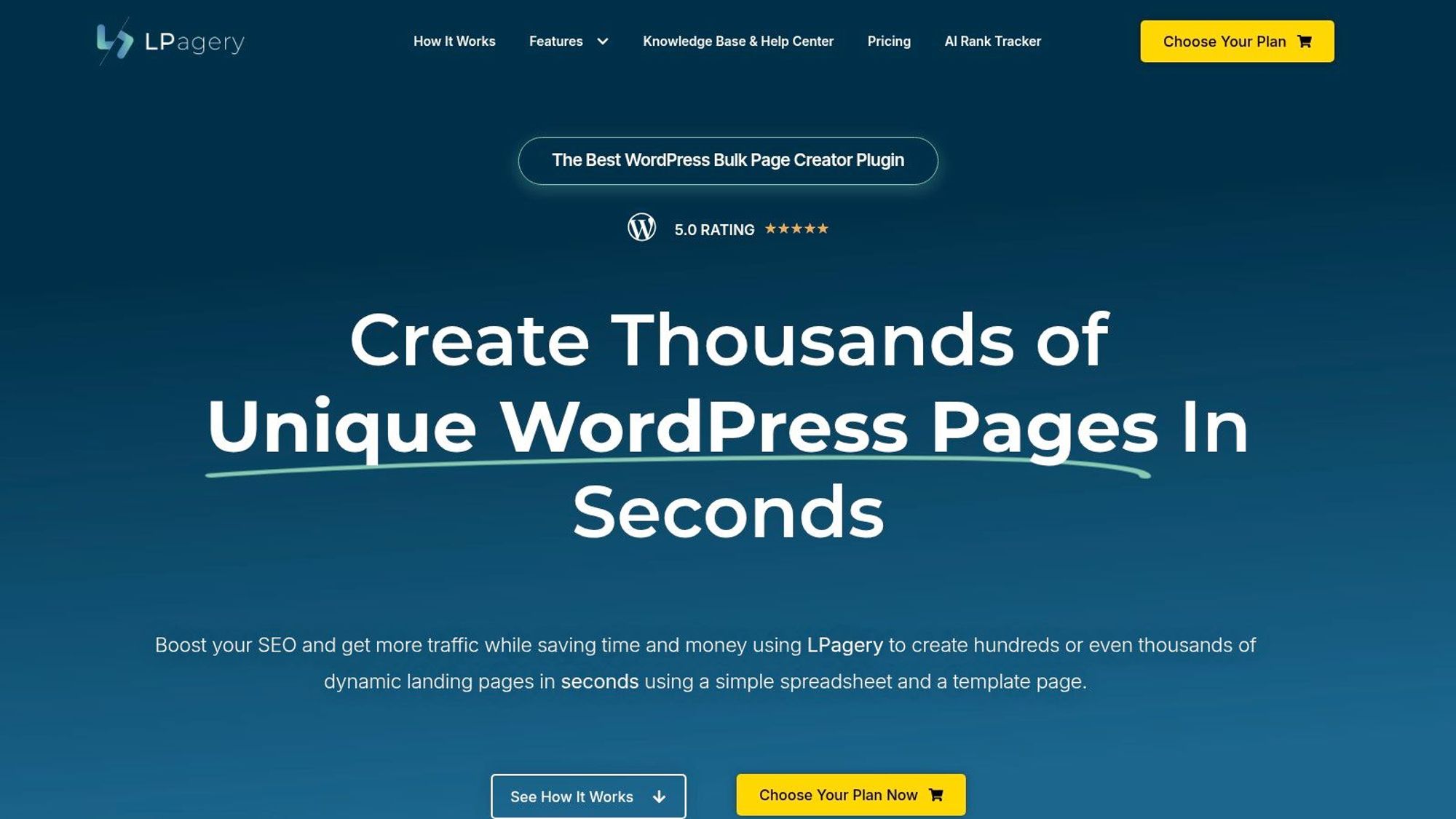 LPagery | Bulk page creation, AI SEO content, Google Sheets sync | Easy, no coding, fast, works with major themes/builders | Scales SEO quickly with unique AI content | SEO pros, local business, agencies | Paid plans, 7-day money-back |