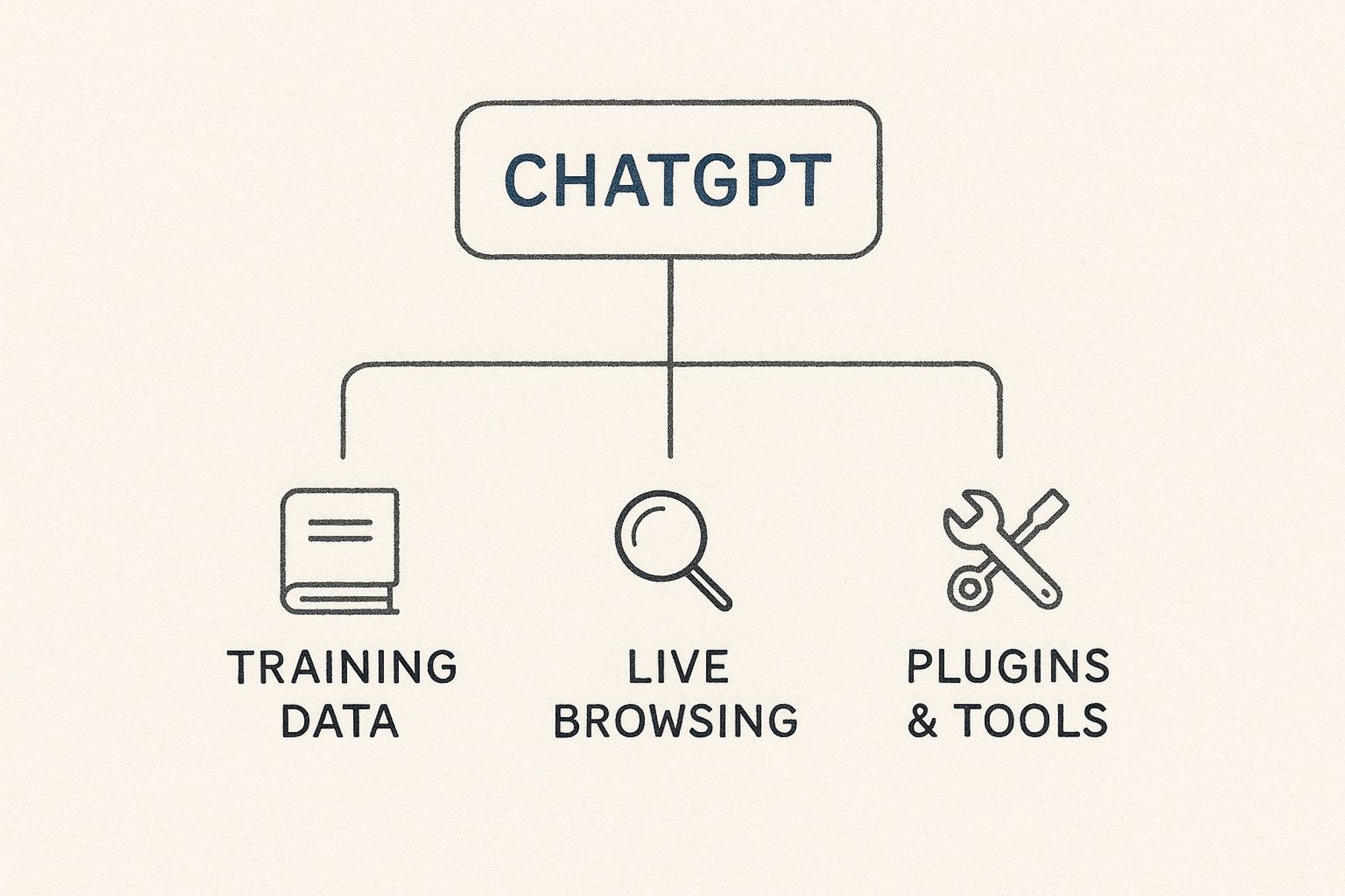 ChatGPT pulls information from three main places: its original training data (the library in its head), live web browsing for up-to-the-minute information, and special plugins and tools for specific tasks.