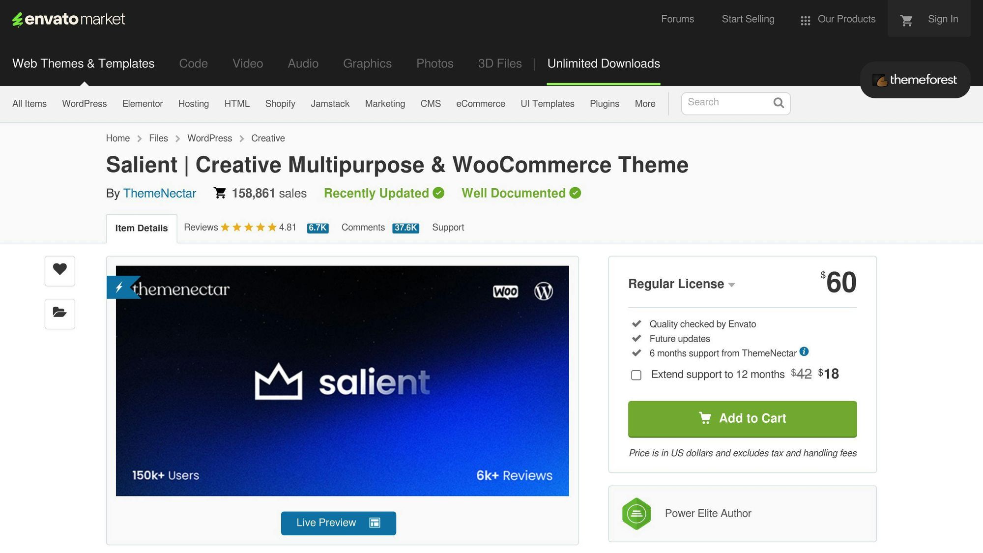 You can purchase Salient on ThemeForest for $60 (single license) or $295 (extended license).